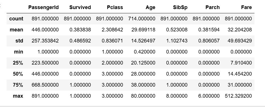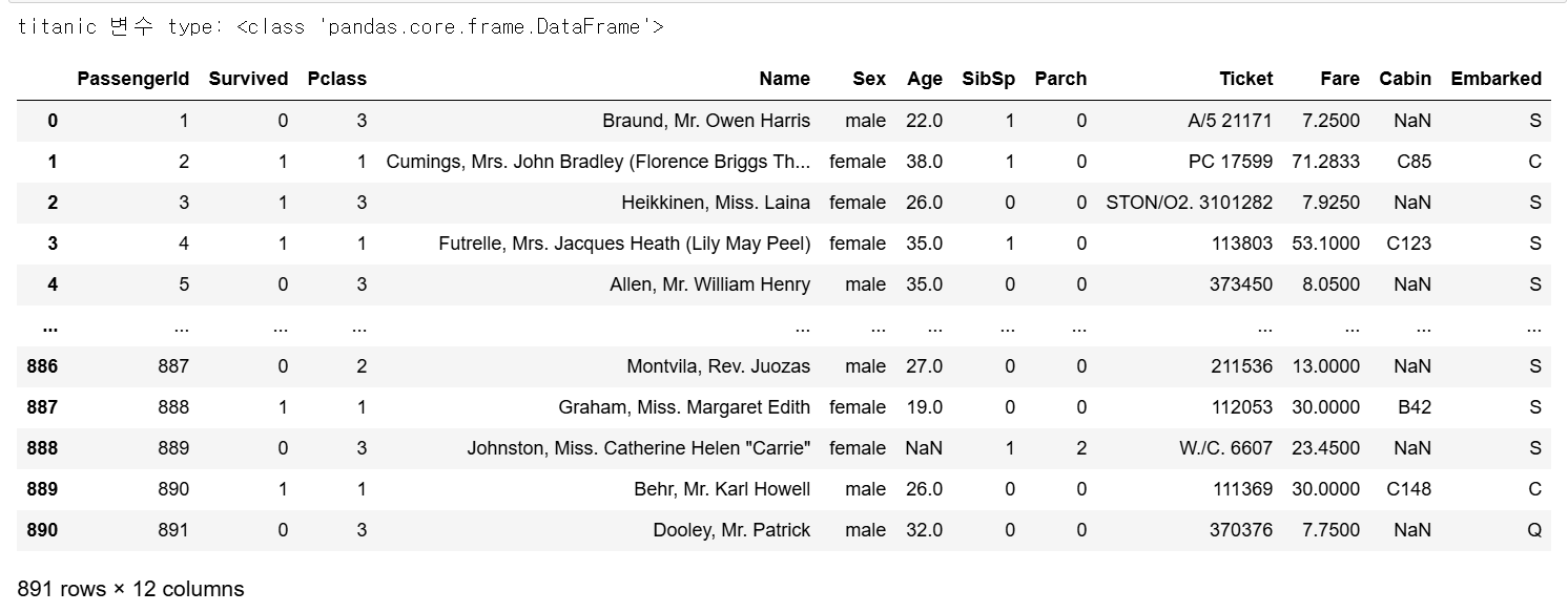 ⏫타이타닉 데이터 세트의 전체 건수는 891건이며 이는 titani_df.shape[0]로 확인할 수 있다.