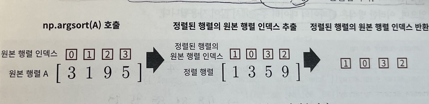 np.argsort( )은 정렬 행렬의 원본 행렬 인덱스를 ndarray형으로 반환한다.