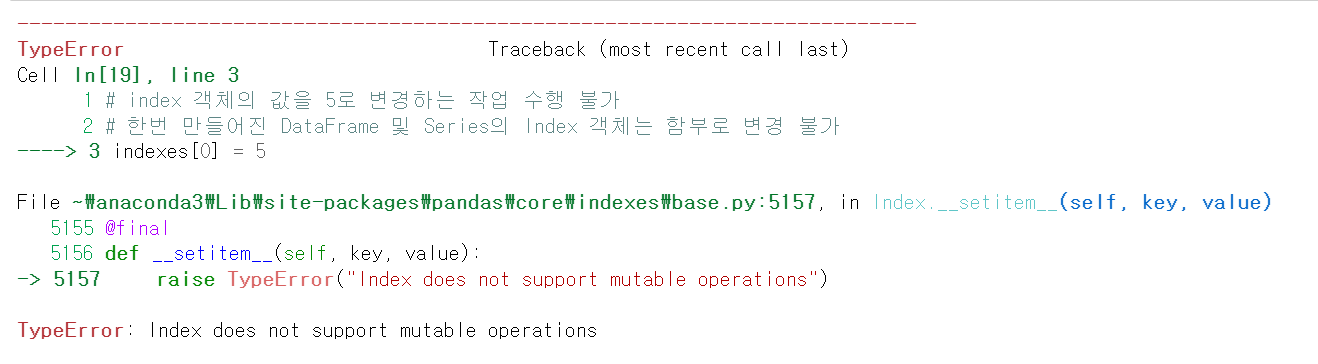 하지만 다음 코드처럼 한번 만들어진 DataFrame 및 Series의 Index 객체는 함부로 변경할 수 없다.