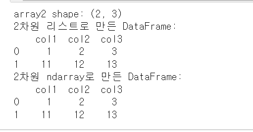 print('2차원 ndarray로 만든 DataFrame:\n',df_array2)