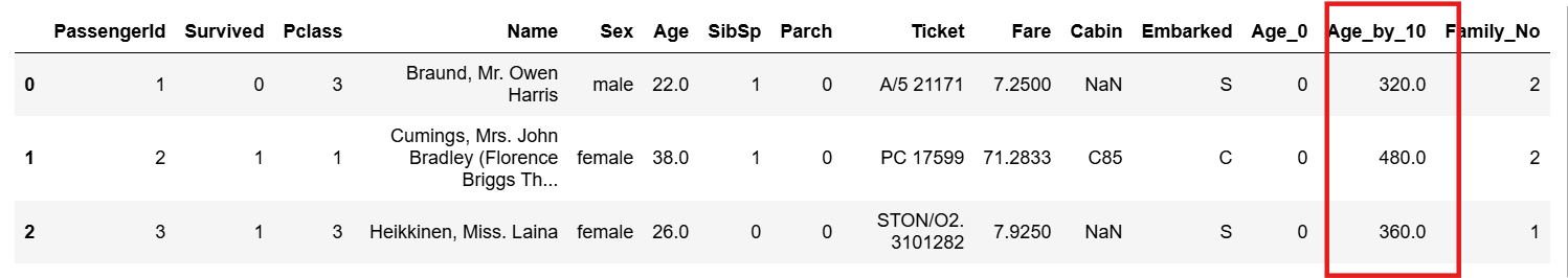 ⏫기존 칼럼 Series를 가공해 새로운 칼럼 Series인 Age_by_10과 Family_No가 새롭게 DataFrame에 추가됨을 알 수 있다.