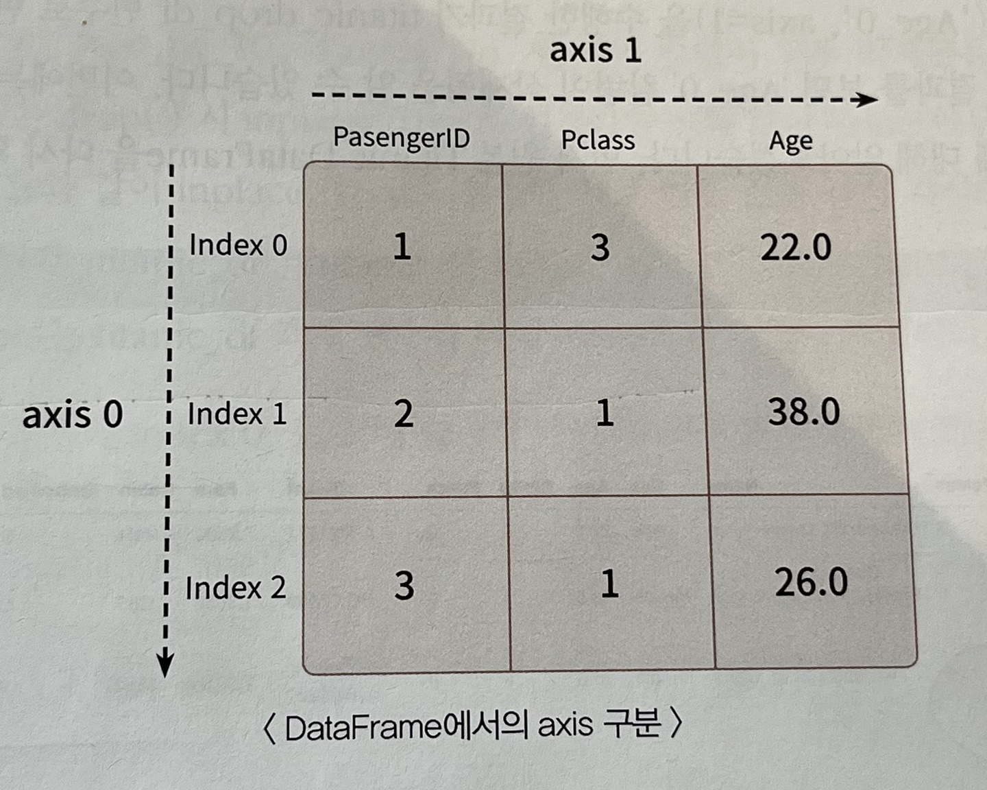- axis : DataFrame의 로우를 삭제할 때는 axis = 0, 칼럼을 삭제할 때는 axis = 1으로 설정