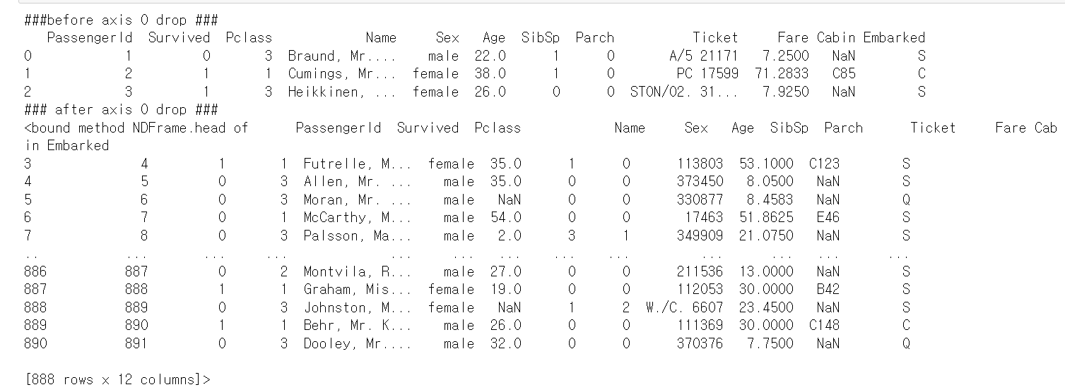 titanic_drop_df 변수의 결과를 보면 'Age_0' 칼럼이 삭제됨을 알 수 있다.
