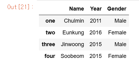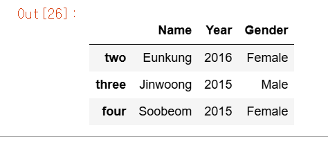 - DataFrame[0:2]와 같은 슬라이싱 연산으로 데이터를 추출하는 방법은 사용하지 말 것!