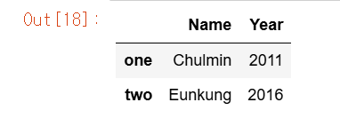data_df.loc['one':'two',['Name','Year']]