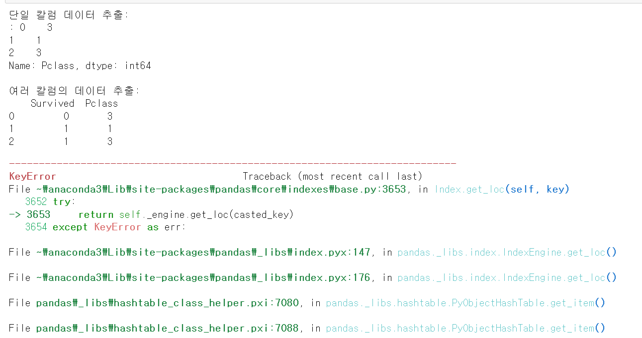 DataFrame에 ['칼럼명']으로 '칼럼명'에 해당하는 칼럼 데이터의 일부만 추출해봤다. 여러 개의 칼럼에서 데이터를 추출하려면 ['칼럼1','칼럼2']와 같이 리스트 객체를 이용하였다. 하지만 titanic_df[0] 같은 표현식은 오류 발생했다. 왜냐하면, DataFrame 뒤의 [ ]에는 칼럼명을 지정해야하는데, 0이 칼럼명이 아니기 때문이다.