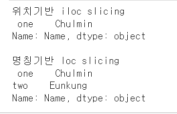 print('명칭기반 loc slicing\n',data_df.loc['one':'two','Name'])