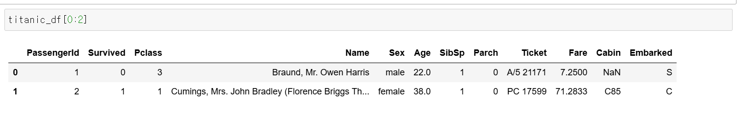 판다스의 인덱스 형태로 변환가능한 표현식은 [ ] 내에 입력가능하다. 가령 titanic_df의 처음 2개 데이터를 추출하고자 titanic_df[0:2]와 같은 슬라이싱을 이용하면 정확히 원하는 결과를 반환한다.
