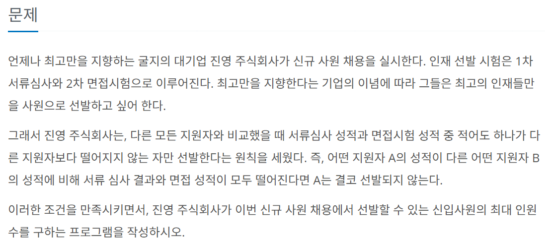 // 0 ~ i-1번째 사람들 중 면접 순위가 가장 높은 사람보다 면접 순위가 높아야 합격