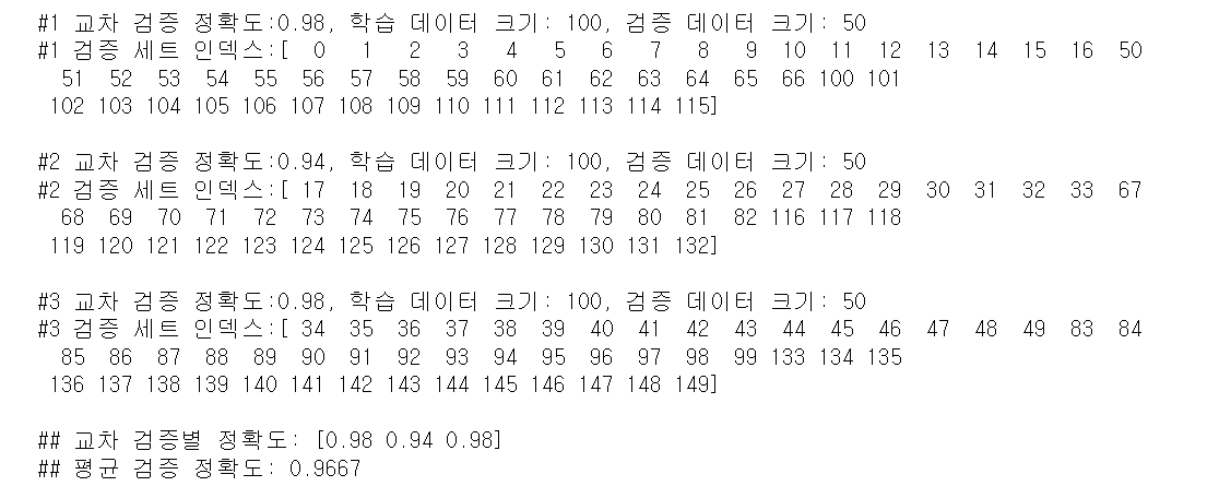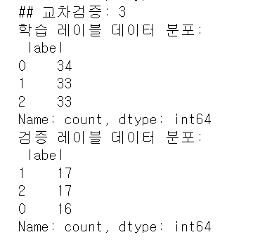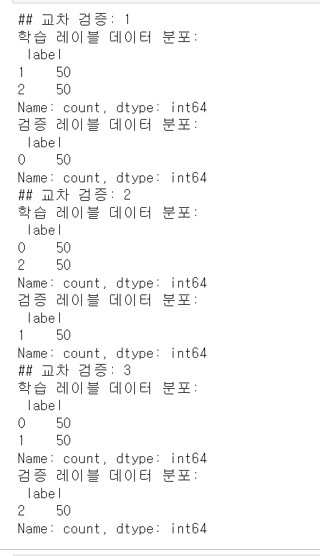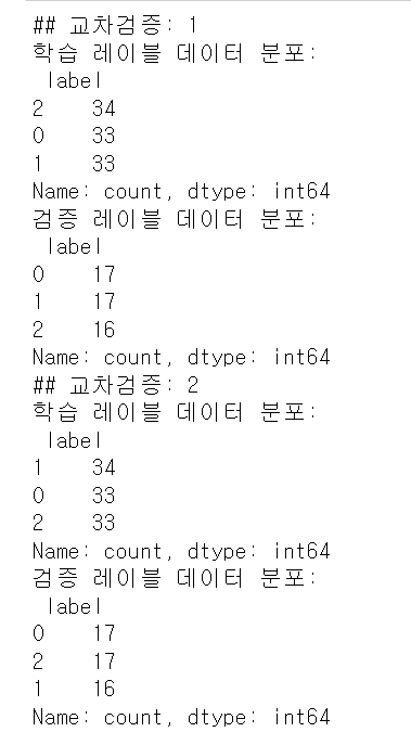 출력 결과를 보며 학습 레이블과 검증 레이블 데이터 값의 분포도가 거의 동일하게 할당됐음을 알 수 있다. 전체 150개의 데이터에서 학습으로 100개, 검증으로 50개가 교차 검증 단계별로 할당된 것을 볼 수 있다.