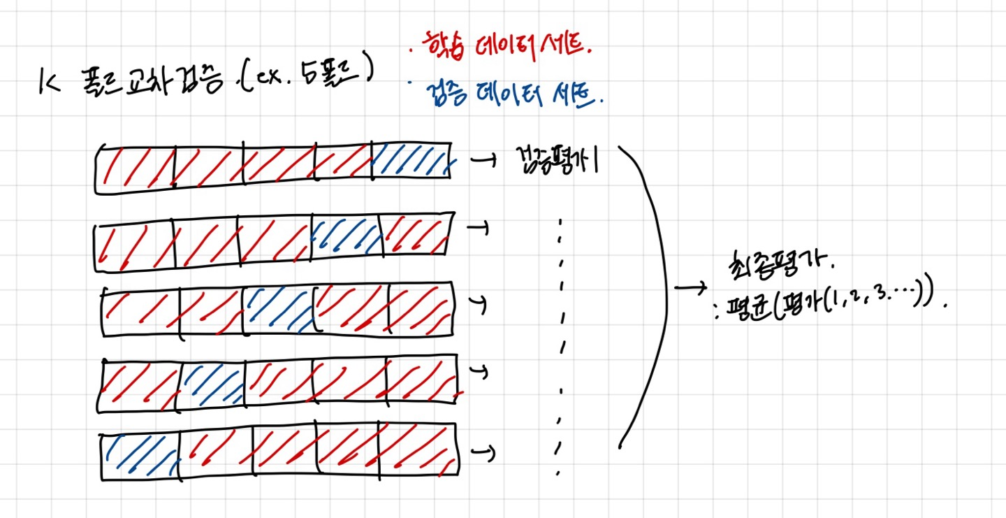 교차검증은 이러한 데이터 편중을 막기 위해서 별도의 여러 세트로 구성된 학습 데이터 세트와 검증 데이터 세트에서 학습과 평가를 수행하는 것이다. 이 결과에 따라 하이퍼 파라미터 튜닝 등의 모델 최적화를 더욱 손쉽게 할 수 있다.