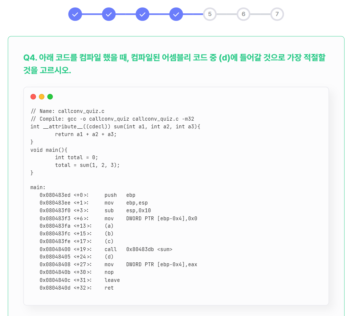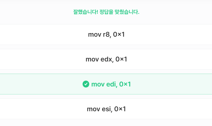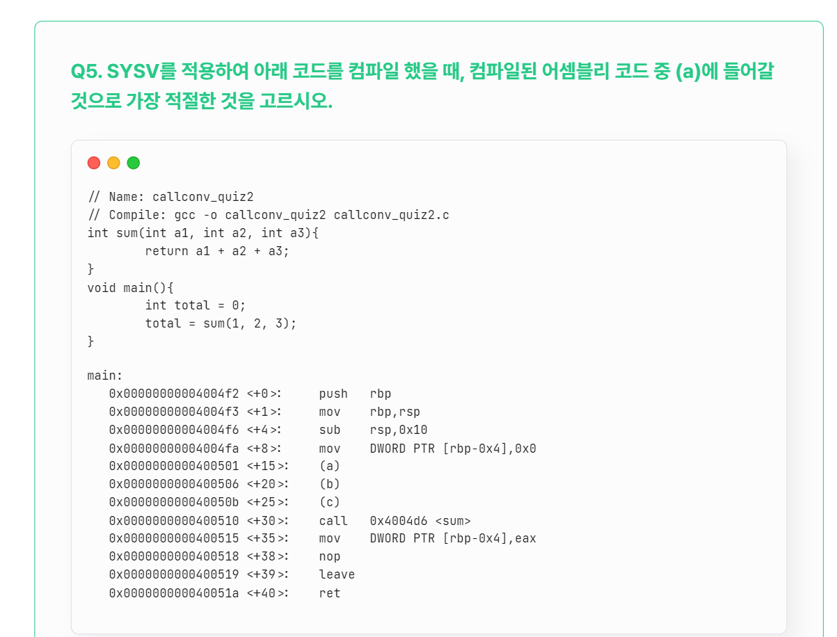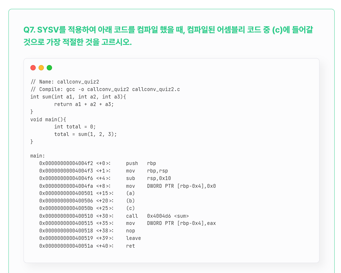 Q5~Q7은 SYSV에서 정의한 함수 호출 규약의 특징 중 6개의 인자를 rdi->rsi->rdx->rcx->r8->r9에 순서대로 저장하여 전달한다고 그랬으니까,,,!!!