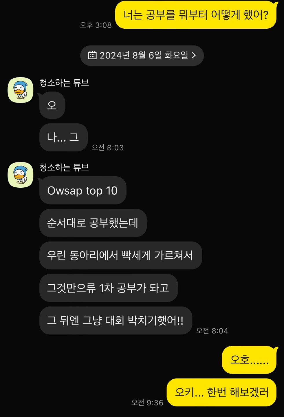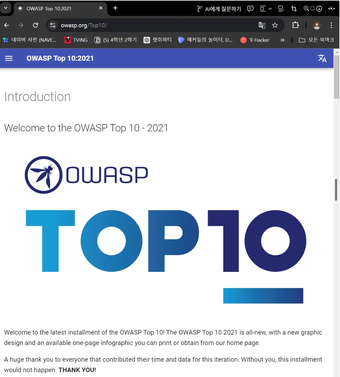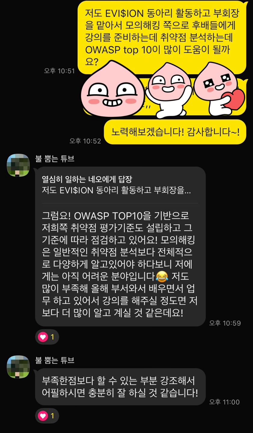 우리학교 금융보안원에 재직 중이신 선배님께 금보원가고 싶기도 하고 여쭤봤다. 그리고 플젝 같이 했던 팀원이 CTF에서 입상하였다고 해서 물어봤기도 했다. 입상한 사람의 말을 듣고 CTF에서 문제 하나라도 풀고 싶어서 OWASP top 10 공부를 해야되겠다 싶어서 동아리에서 심화스터디로 OWASP top 10 강의를 진행하기로 하였다.