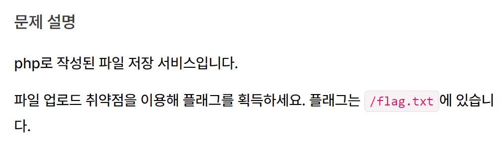 php로 작성된 파일 저장 서비스입니다. 파일 업로드 취약점을 이용해 플래그를 획득하세요. 플래그는 /flag.txt에 있습니다. Reference Server-side Basic