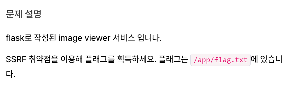 flask로 작성된 image viewer 서비스 입니다. SSRF 취약점을 이용해 플래그를 획득하세요. 플래그는 /app/flag.txt에 있습니다. 문제 수정 내역 2023.07.17 css, html 제공 Reference Server-side Basic