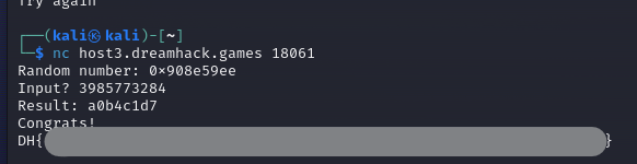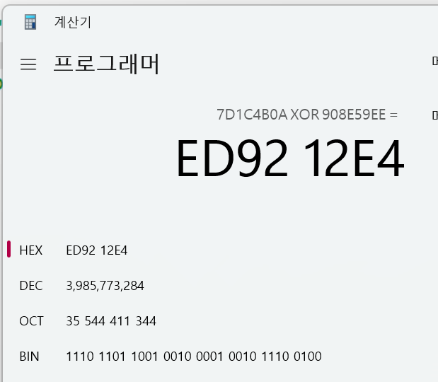 그리고 입력받을 %d로 형식지정자가 되어있으므로 10진수로 넣어야함!!! 따라서 3985774284를 넣으면 된다.