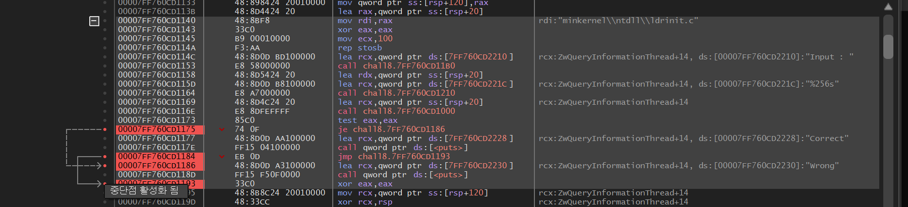 Reversing Basic Challenge #8 이 문제는 사용자에게 문자열 입력을 받아 정해진 방법으로 입력값을 검증하여 correct 또는 wrong을 출력하는 프로그램이 주어집니다. 해당 바이너리를 분석하여 correct를 출