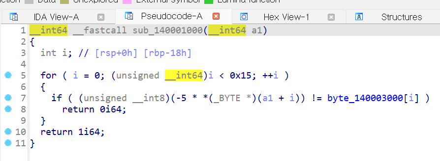 if문에 (unsigned __int8)(-5**(_BYTE *)(a1+i)) != byte_140003000[i]가 거짓이겠끔 파이썬을 구현해줘야함