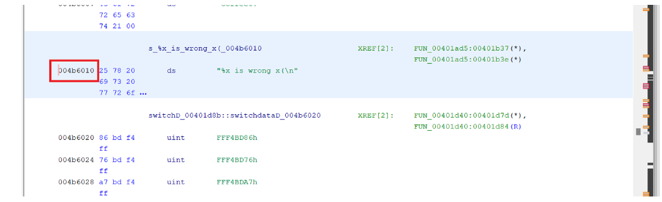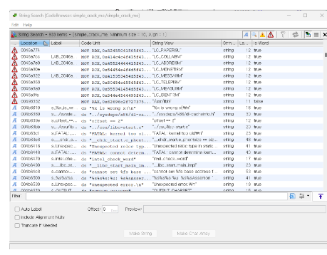 빨간 네모친 부분은 프로그램 상에서 해당 문자열의 위치를 나타내는 16진수 주소값.