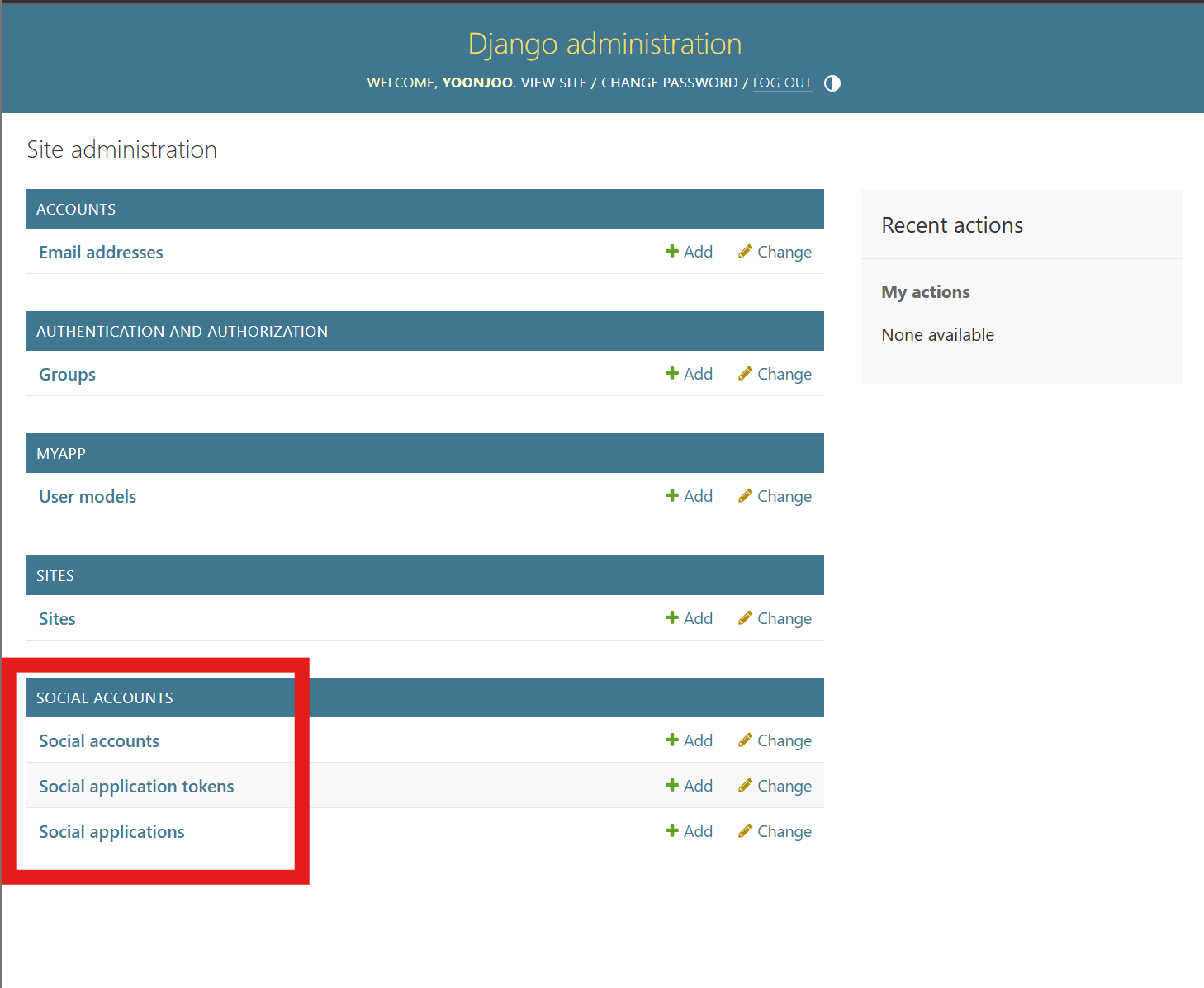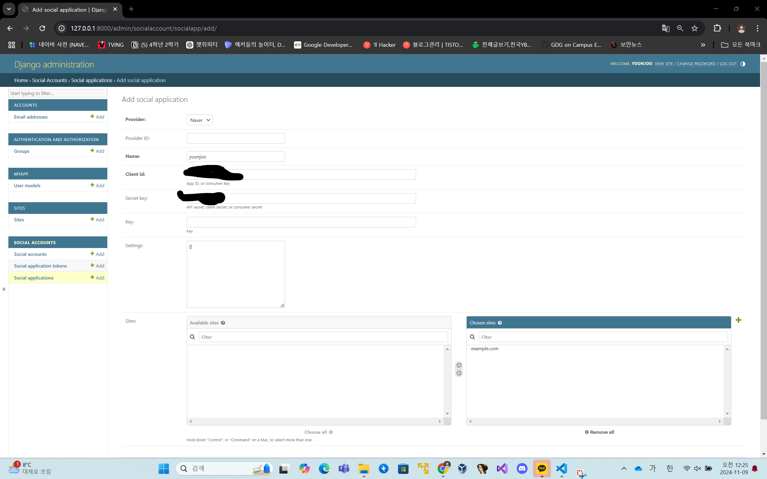 장고 admin에 들어가면 메뉴에 소셜 애플리케이션을 클릭 후 소셜 어플리케이션을 추가