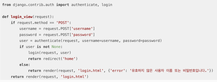 뷰 : Django에는 사용자 인증 작업을 처리하는 뷰가 포함되어 있음.