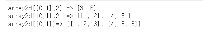 ' : ' 사이에 시작 인덱스와 종료 인덱스를 표시하면 시작 인덱스에서 종료인덱스-1의 위치에 있는 데이터의 ndarray를 반환함.