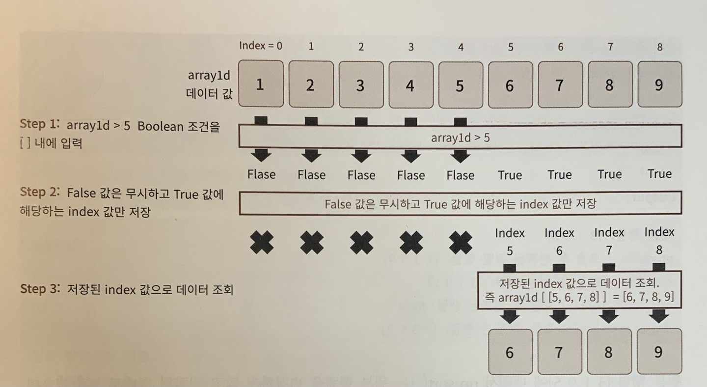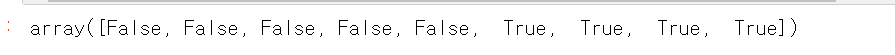 즉, array([False, False, False, False, False, True, True, True, True])에서 False가 있는 인덱스 0~4는 무시하고 인덱스 [5,6,7,8]이 만들어지고 이 위치 인덱스에 해당하는 데이터 세트 [6,7,8,9]를 반환하게 됨.