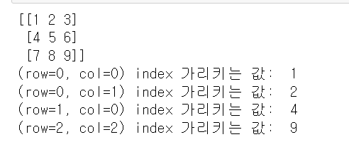 print('(row=0, col=1) index 가리키는 값: ', array2d[0,1])